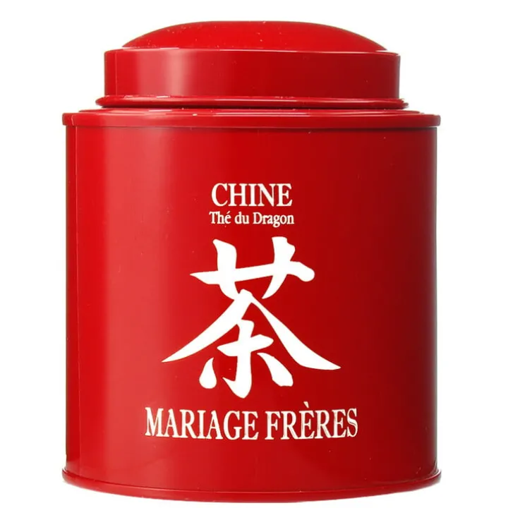 Boîte métallique laquée et sérigraphiée contenant 50g de thé vert sculpté et parfumé au jasmin.