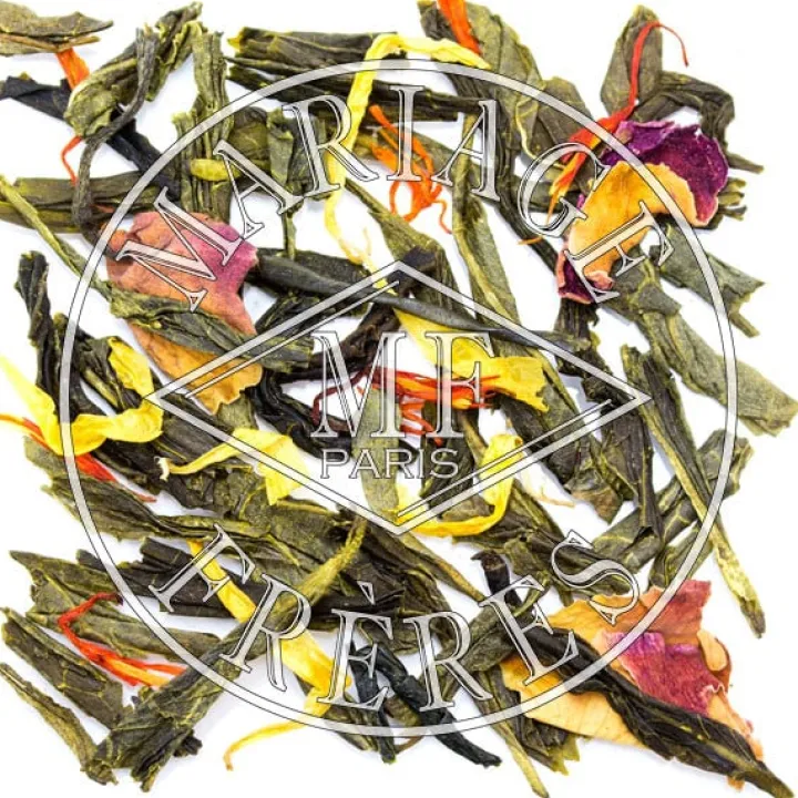 Un thé vert couleur jade est ici allié avec grâce à des fruits des montagnes du Triangle d’or – mangue, ananas, baël… – et à des fleurs – rose, souci – pour une tasse qui résonne comme un soyeux élixir.