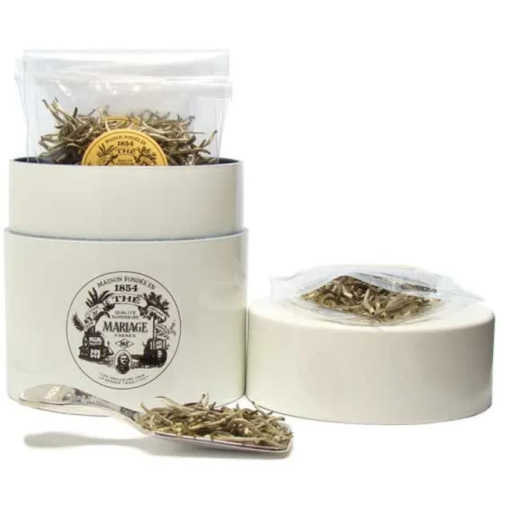 Thé Blanc Sacré, comme le porte en lettres d’argent ce thé sacré, en tasse, la tendre infusion des bourgeons libère un parfum sublime de fleur blanche, de truffe et de sous-bois.
