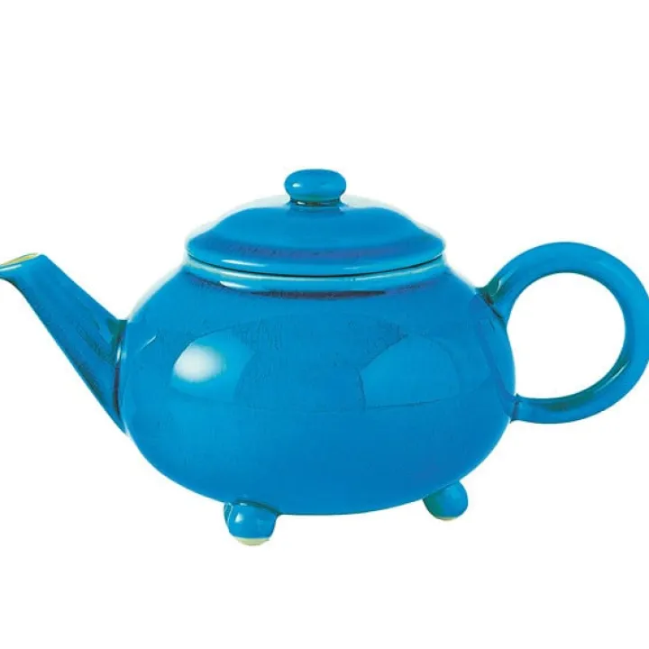 Théière en céramique émaillée turquoise fabriquée en France, de forme ronde et élégante sur ses trois pieds.