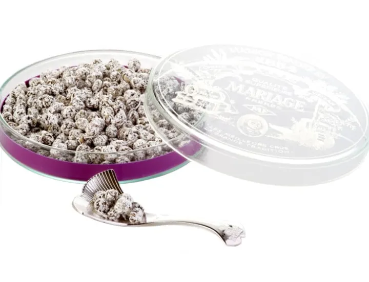 Ces perles de thé vert sont sculptées et délicatement enveloppées, une à une, d’argent le plus fin pour en faire des gemmes chatoyantes et étincelantes.