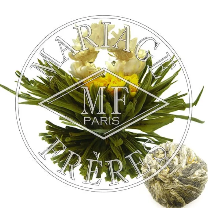 Un thé vert façonné du Fujian, parfumé par contact au jasmin le plus fin et agrémenté d’une fleur de souci. Ils dessinent dans la tasse une véritable robe de fée.