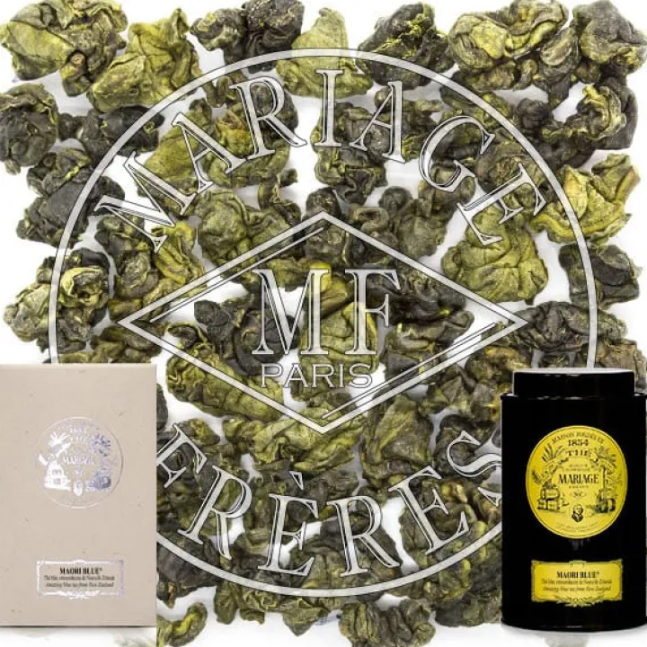 Boîte métallique renfermant 50g de Thé Bleu™ de Nouvelle Zélande logée dans un étui ivoire réhaussé d’un logo argent.