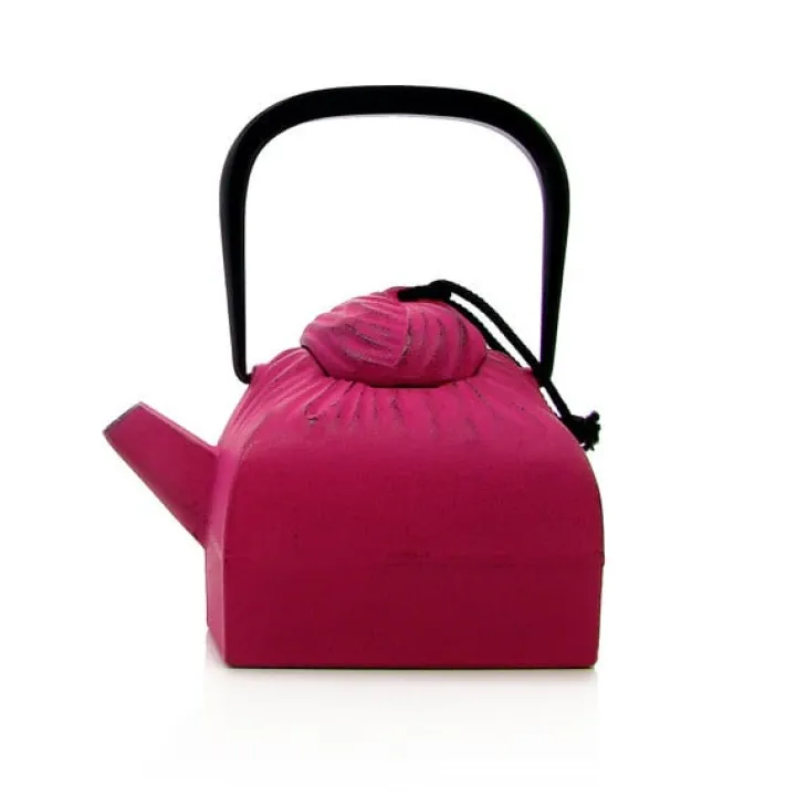 Cette théière carrée et incurvée en fonte et 100% rose fuchsia, comme « emballée » dans une étoffe dont on a relevé puis noué les quatre coins, est surmontée d’une anse en métal.