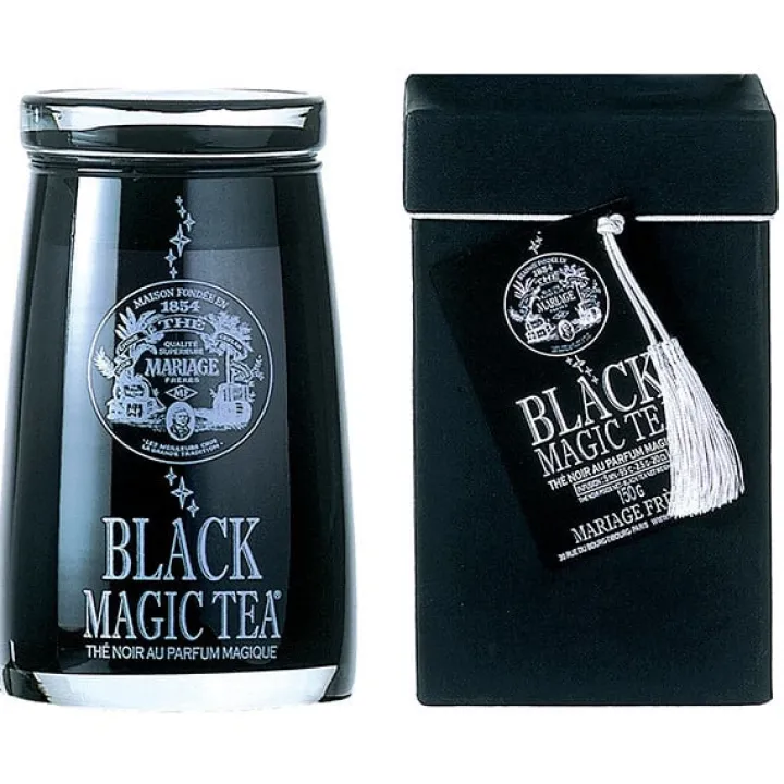 lacon noir en verre soufllé contenant 150g de thé noir parfumé