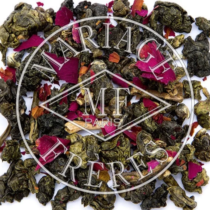 Les perles de thé façonnées à la main sont délicatement parfumées avec des pétales de rose des montagnes.