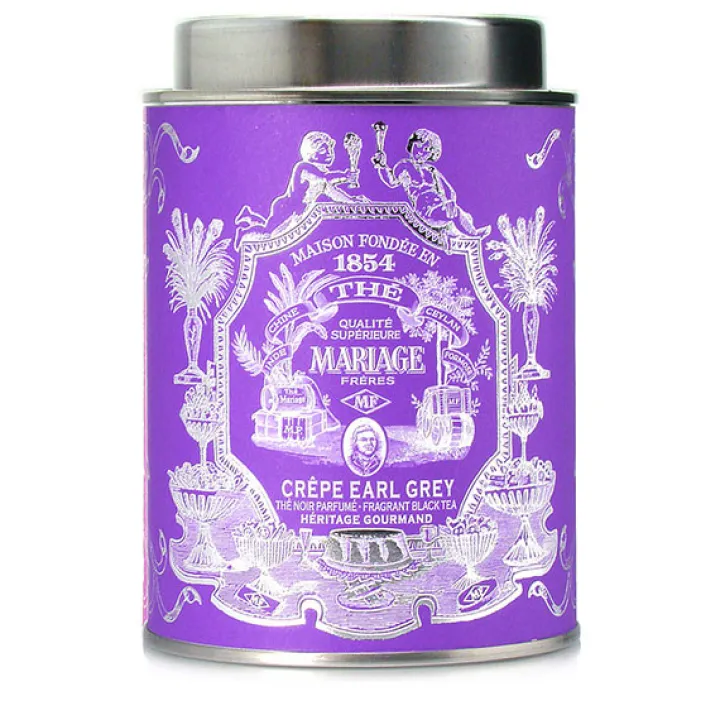 Le thé Crêpe Earl Grey est amoureusement logé dans un écrin ultraviolet aux reflets argentés.
