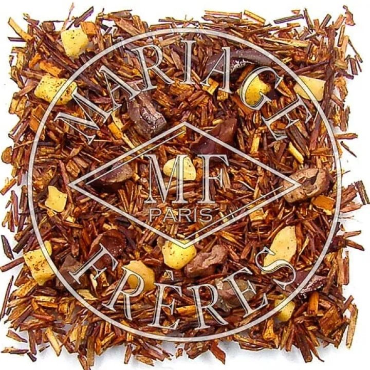 Au rooibos rouge naturellement sans théine sont associés les parfums de marrons nobles confits au sucre et à la vanille Bourbon offrant une tasse suave, chaude et festive aux élans fruités et un rien épicés.
