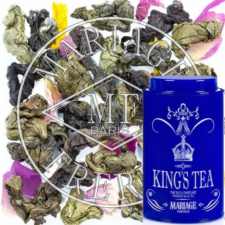 Pour le Roi, une composition secrète de Thé Bleu de Thaïlande au parfum d’épices douces et de bergamote enrichi de pétales de roses jaunes et rosées.