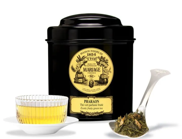 Depuis l’aube de l’Histoire, le pharaon assure l’harmonie entre les hommes et le ciel et prodigue prospérité. Il fallait bien, pour rendre justice à la grandeur du Pharaon, un somptueux mariage de thé vert et de fruits du delta du Nil où se distingue la mangue confite.