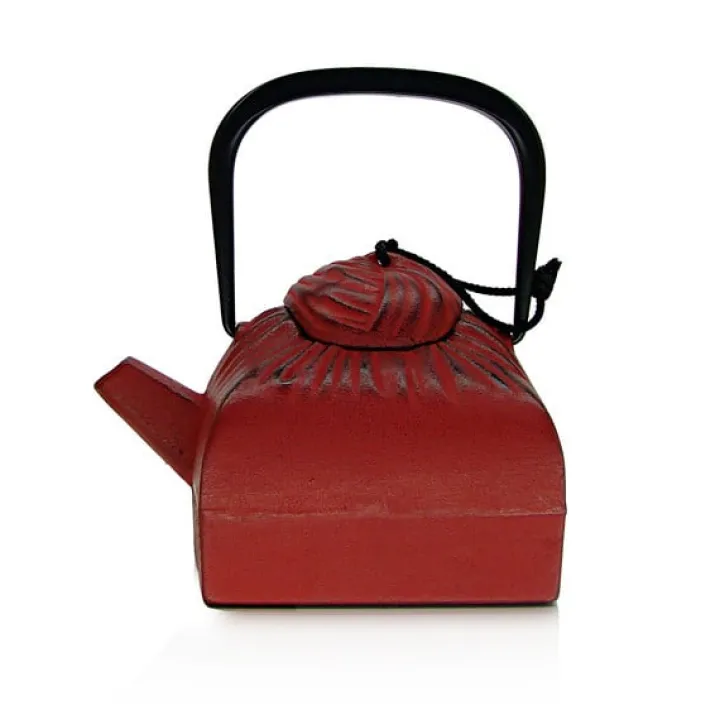 Cette théière carrée et incurvée en fonte et 100% rouge, comme « emballée » dans une étoffe dont on a relevé puis noué les quatre coins, est surmontée d’une anse en métal.