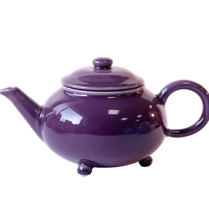 Théière en céramique émaillée pourpre fabriquée en France, de forme ronde et élégante sur ses trois pieds.
