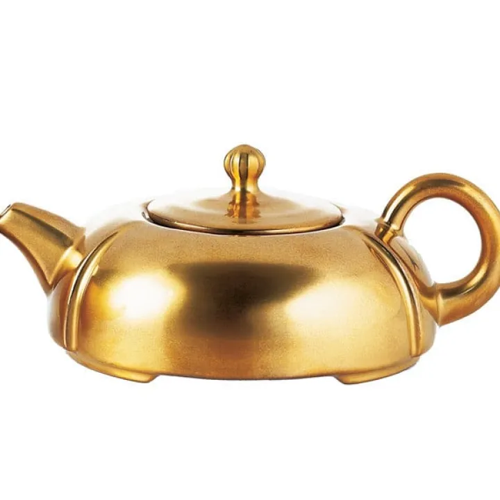 Théière en céramique fabriquée en France, émail dorée mat; plate comme une lune, basse et ronde, elle veille, radieuse, sur la destinée de ses protégés qu’elle éclaire et dont elle guide les pas.