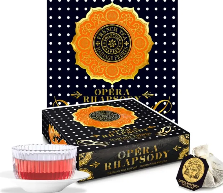Comme une nuit à l’Opéra, cette composition de thé blanc aux reflets rosés est luxuriante et riche d’accents chantants de vanille et de fruits rouges. Opéra Rhapsody® enrobe le palais de tonalités veloutées et chaudes comme la voix d’un ténor. Un étui noir rehaussé d’orange et d’or évoque les feux de la rampe.