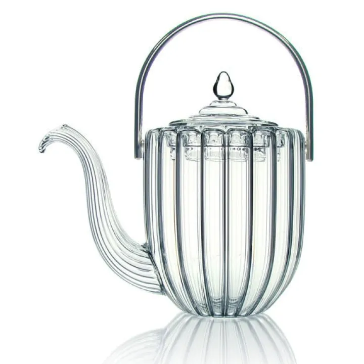 Les lignes verticales et généreuses de cette théière en verre soufflé sont contrastées de souples ondulations et transportent vers les sommets himalayens.