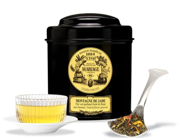 Un thé vert couleur jade est allié avec grâce à des fruits des montagnes du Triangle d’or – mangue, ananas, baël… – et à des fleurs pour une tasse qui résonne comme un soyeux élixir.