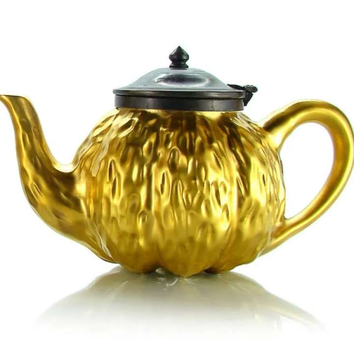 Théière en céramique fabriquée en France, émail doré mat, avec un couvercle en étain et une charnière patinée à l’ancienne, elle contient 0,5 l.