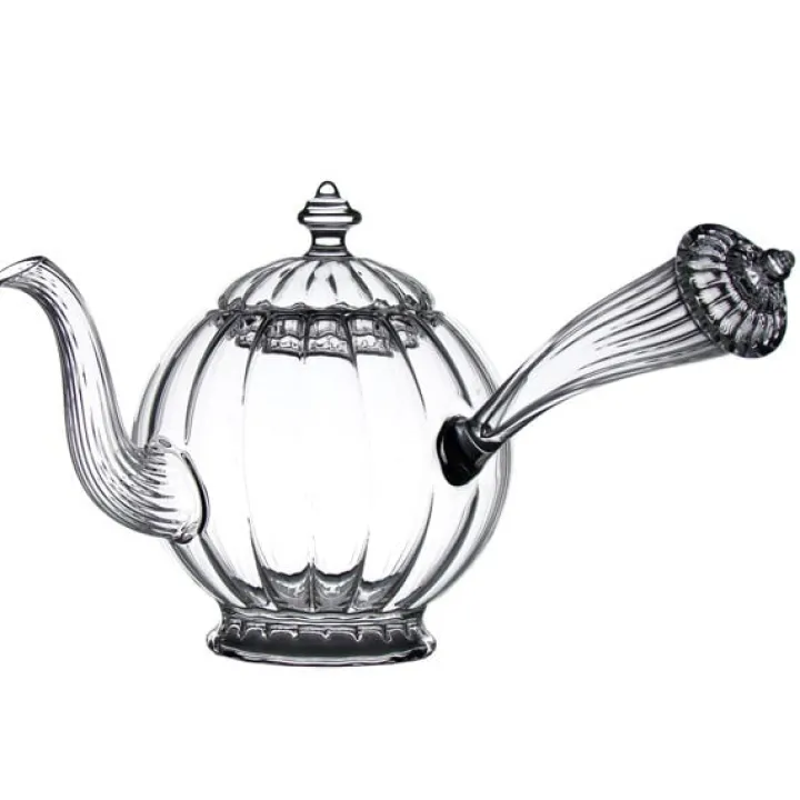 Théière en verre soufflé bouche, ondulante, au corps rassurant et au long bec relevé, à la poignée volontaire qui passe du faux-semblant du déjà vu à la surprise du jamais-vu.