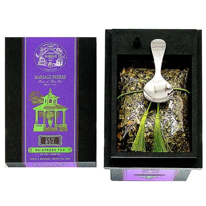 Une boîte à musique en bois, enserrée d’un ruban violet fluo renfermant le nouveau mélange de-stress tea aux tonalités apaisantes – bouquet de fleurs de thé, de lavande, de bleuets et d’oranger- ainsi qu’un doseur en métal argenté. S’envolent les notes très relaxantes d’une douce mélodie japonaise, une invitation à l’ultra-zenitude.
