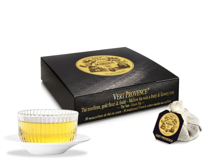 Vert Provence® restitue la magie de ce Sud ardent, en un grand thé vert au parfum fleuri, marié à de petits fruits rouges, noirs, mûrs, pour un bouquet intense qui arrondit la bouche de leurs arômes concentrés et agrémenté de lavande douce à l’arôme chaud et camphré et de pétales de rose.