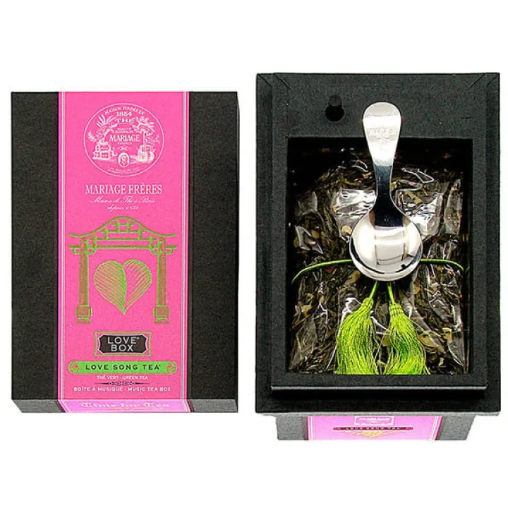 Une boîte à musique en bois, enserrée d’un ruban rose fluo et renfermant un thé vert sensuel au lait d’amandes et un doseur argenté. L’air passionné des pêcheurs de perles accompagne la romance des happy lovers.