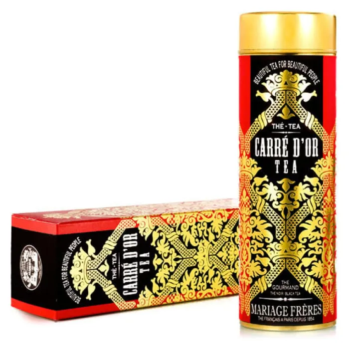 Le thé CARRÉ D’OR® est inspiré d’une icône gourmande de nos Salons de Thé : fabuleux dessert au chocolat noir avec un coeur de caramel sur un coulis de groseilles.