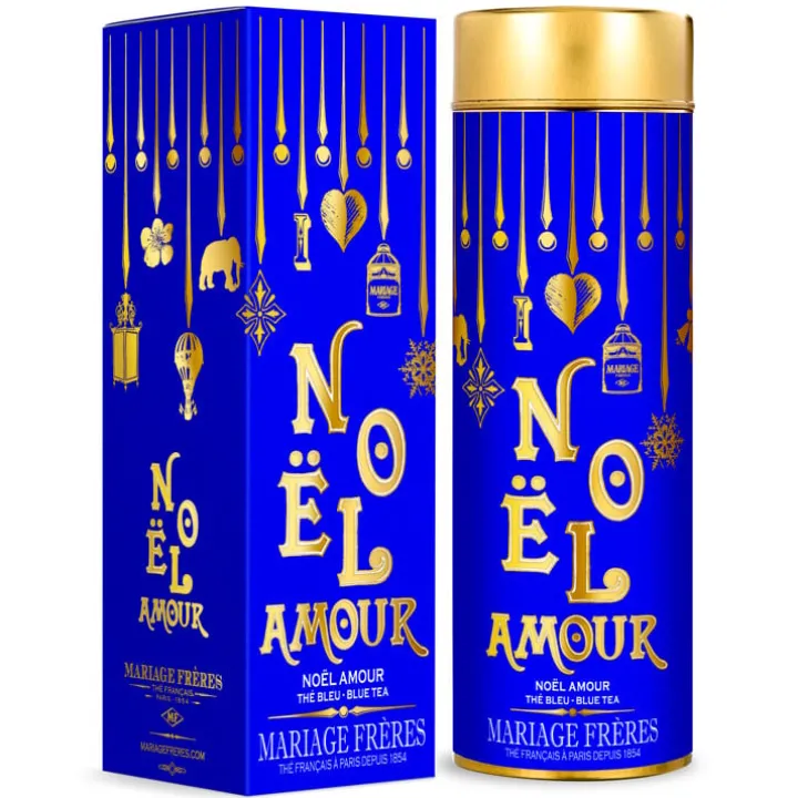 Le flacon joyeusement décoré de pampilles dorées du thé bleu Noël Amour est un merveilleux porte-bonheur à offrir pour les fêtes.