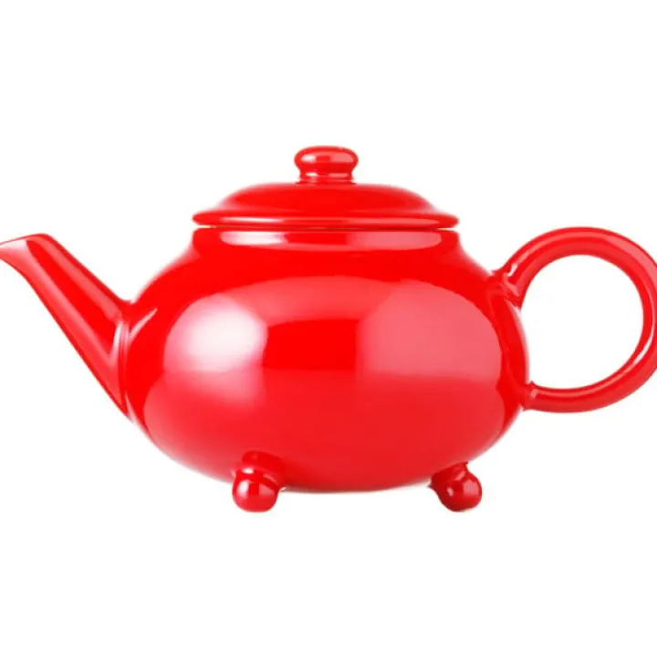 Théière en céramique émaillée rouge fabriquée en France, de forme ronde et élégante sur ses trois pieds.