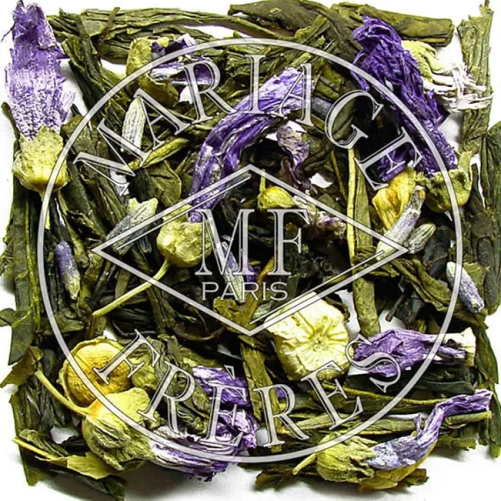 Ce thé vert parfumé d’épices douces et de fleurs blanches est parsemé de pétales de mauve qui évoquent les ciels indigo des impressionnistes.