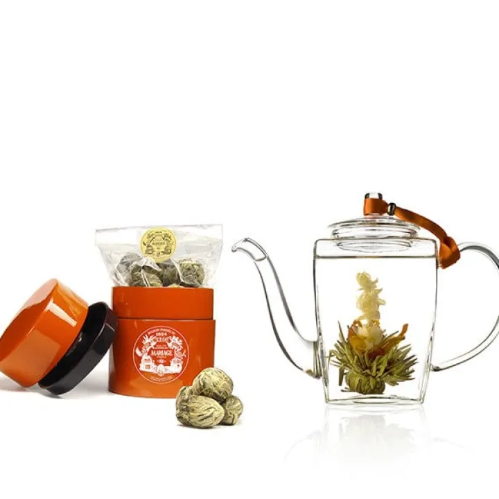 Sa forme cubique permet d’admirer l’éclosion des thés façonnés, sa contenance est pensée pour infuser une boule de thé, et laisse libre jeu au spectacle de l’infusion.