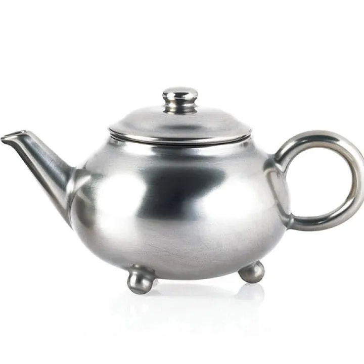 Théière en céramique émail platiné fabriquée en France, de forme ronde et élégante sur ses trois pieds.