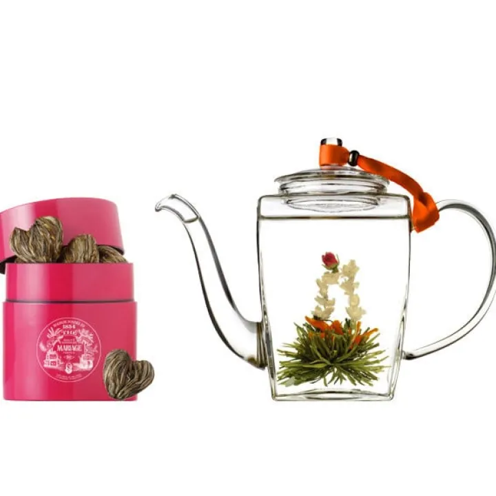 Coffret classique noir renfermant une théière en verre (0,35l) & une boîte laquée fuchsia à double couvercle contenant 9 « cœurs de thé vert ».
